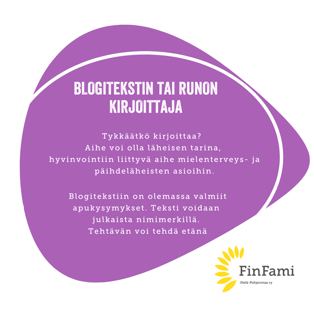 Tykkäätkö kirjoittaa? Haluaisitko kirjoittaa blogitekstin, runon tai tarinan, joka julkaistaan yhdistyksen internetsivuilla tai sosiaalisen median kanavissa. Teksti voi olla esim. läheisen tarina, hyvinvointiin liittyvää tai kannanotto ajankohtaisiin asioihin mielenterveys ja päihderiippuvaisten läheisiin liittyvissä asioissa.