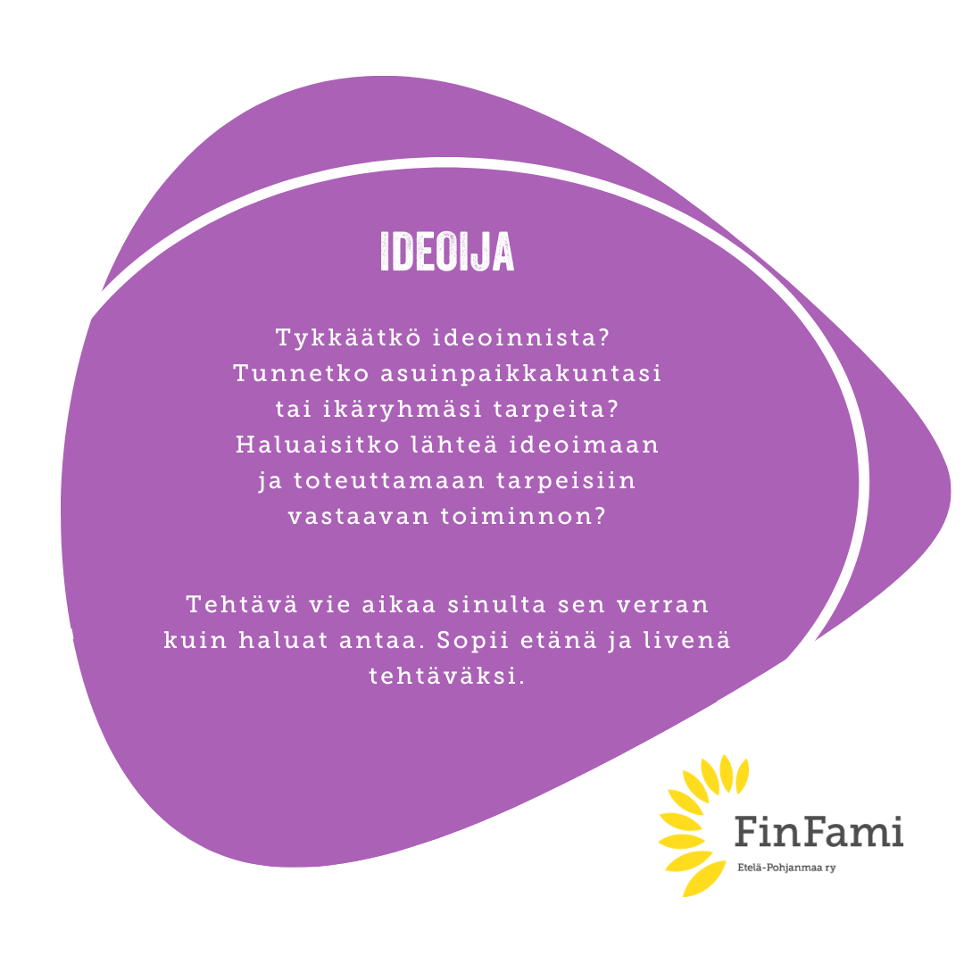 Ajankäyttö: Ajallisesti tehtävä vaatii sinulta aikaa keskimäärin 1-3 tuntia. Suunnittelu voidaan toteuttaa kasvotusten tai esim. Teamsin välityksellä.