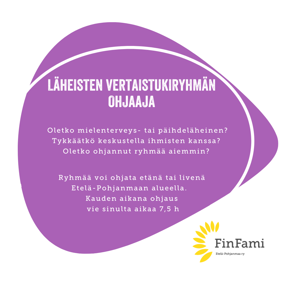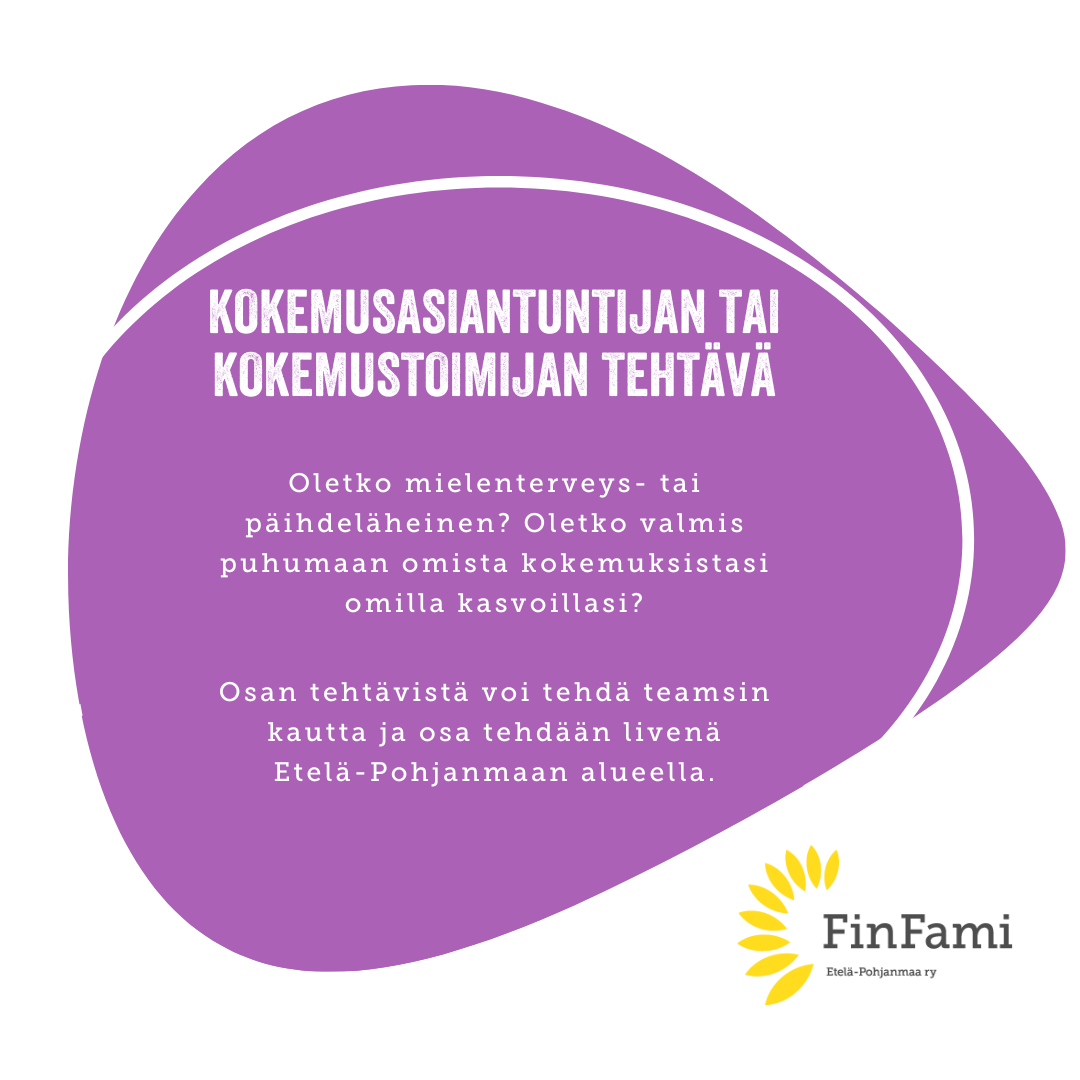 Kokemuspuheenvuorot mielenterveys- tai päihdeläheisen näkökulmasta esim. toiminnan esittelyissä, tapahtumissa, paneelikeskusteluissa, tietoiskuissa/webinaareissa ja vertaistukiryhmissä. Sinulla tulee olla oma kokemus läheisenä, joko psyykkisestä oireilusta/sairaudesta tai päihteitä ongelmallisesti käyttävän läheisenä.
