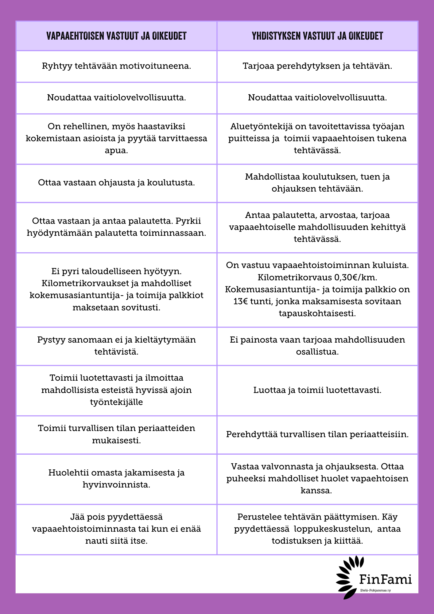 Meille on tärkeää, että vapaaehtoisemme saavat toimia omilla vahvuuksillaan itseään kiinnostavissa tehtävissä. Vapaaehtoistoiminta tuo vapaaehtoiselle iloa, jaksamista ja merkityksellisyyden kokemuksia. Vapaaehtoisten hyvinvointi ja oma jaksaminen ovat meille tärkeitä asioita.
